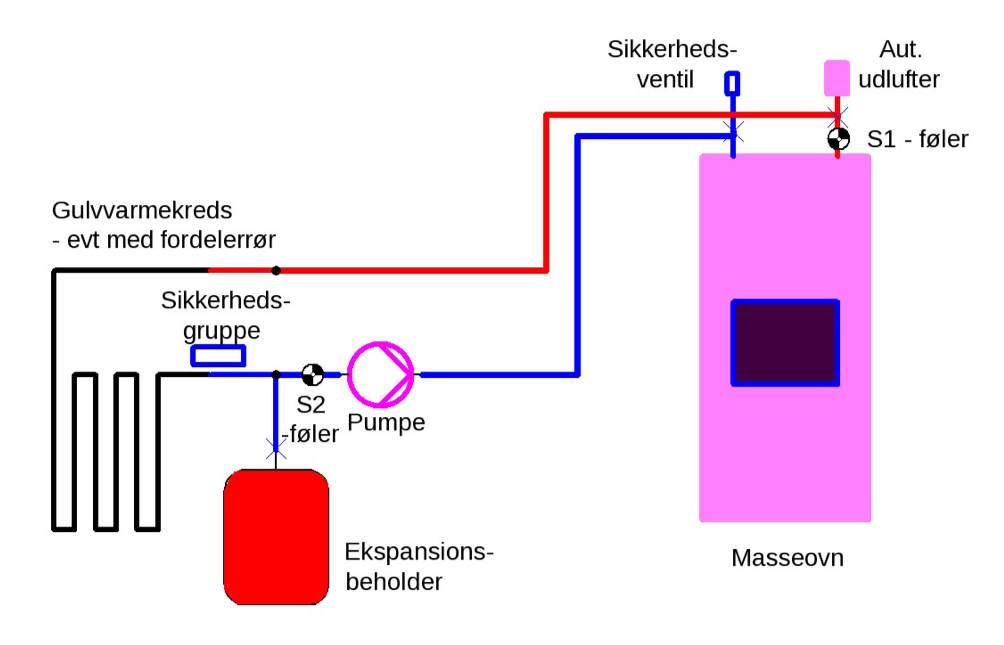 Når der fyres i masseovnen, forplanter varmen sig til udgangsrøret oven på ovnen, styringen mærker temperaturstigningen via sin føler her og starter pumpen. Varmen føres ud i varmesystemet, som kan være gulvvarme eller radiatorer.