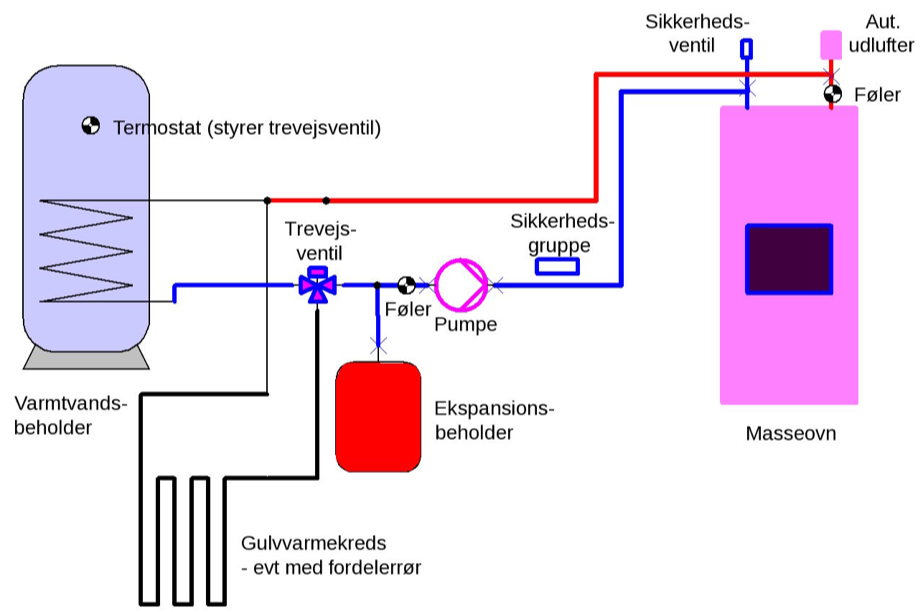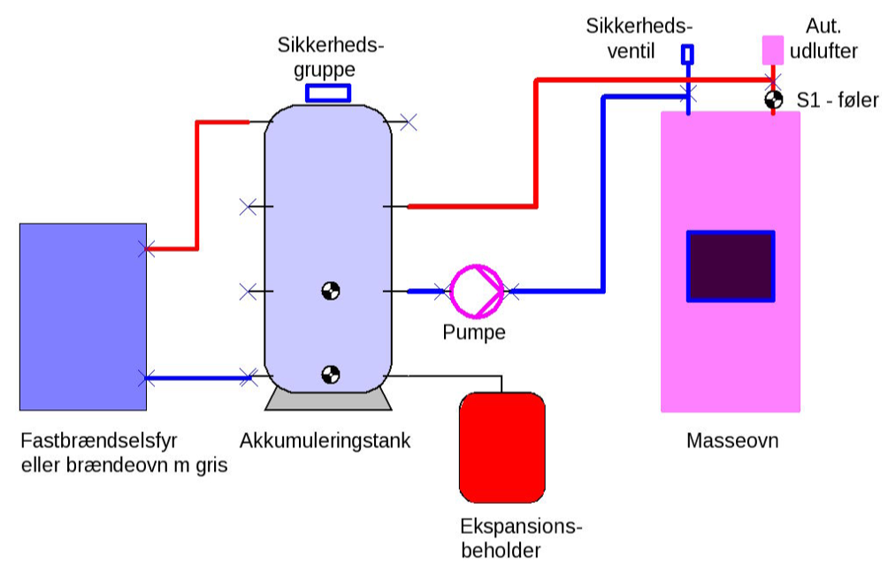 Diagram 13: Masseovn, akkumuleringstank og fastbrændselsfyr eller brændeovn med vandgris